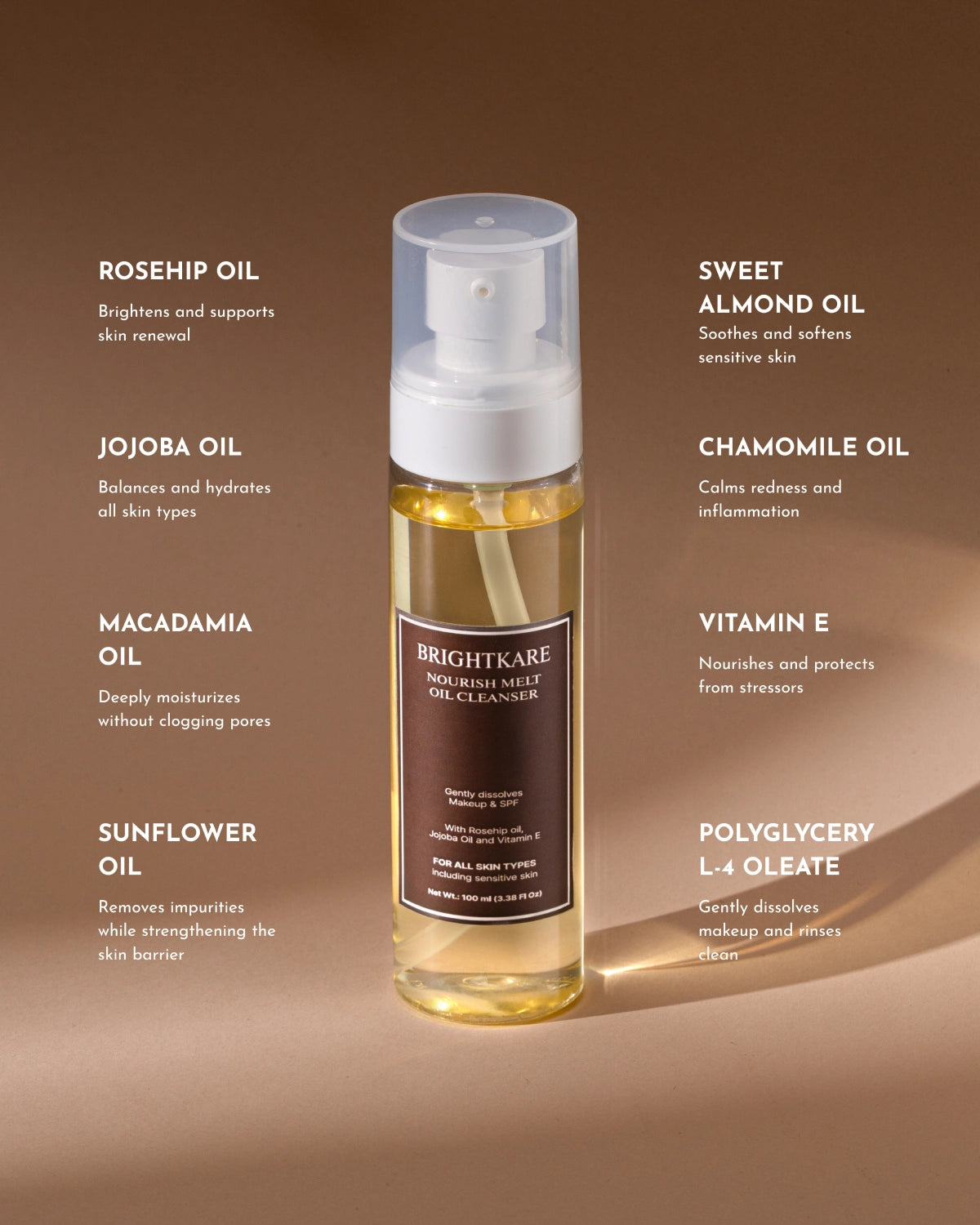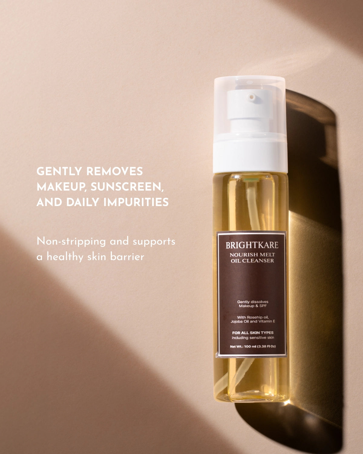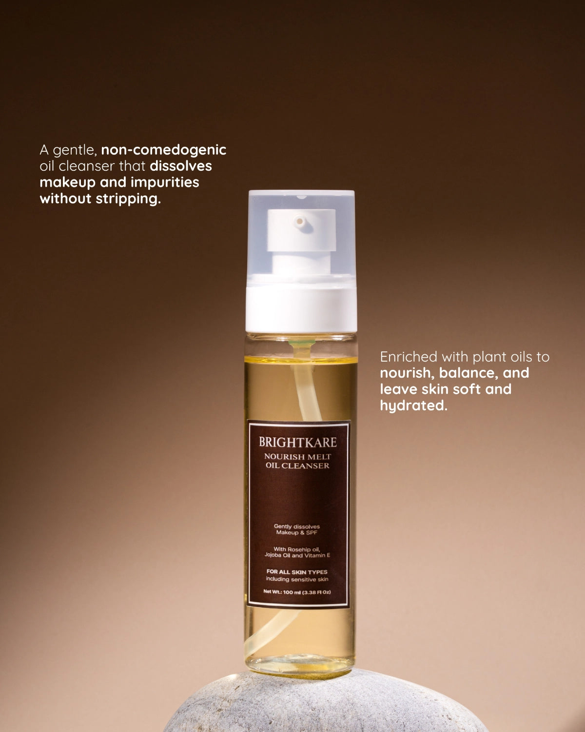 BrightKare’s Nourish Melt Oil Cleanser stands out for its luxurious yet skin-conscious formulation that cleanses deeply while caring for the skin barrier. Infused with a powerful blend of botanical oils—including sunflower, jojoba, macadamia, rosehip, and chamomile—it effortlessly dissolves makeup, sunscreen, and impurities without stripping natural moisture. Enriched with Vitamin E, the formula delivers antioxidant protection and leaves the skin soft, hydrated, and radiant. Thoughtfully crafted to be non-comedogenic, fragrance-free, and gentle on sensitive skin, it’s the perfect first step in your double-cleansing ritual, ensuring your skin feels nourished, balanced, and refreshed after every use.