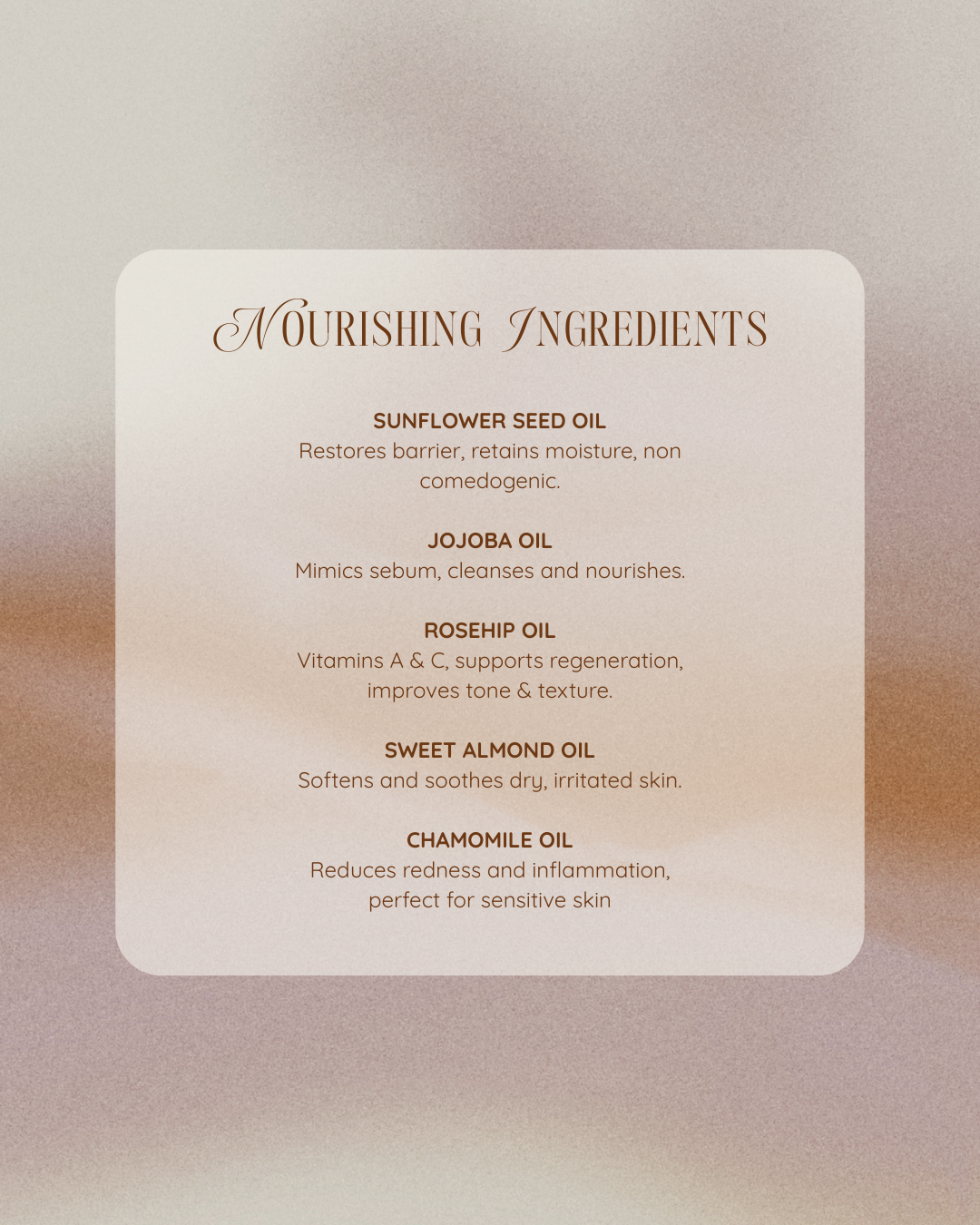 Helianthus Annuus (Sunflower) Seed Oil, Isomyl Laurate, Macadamia Integrifolia Seed Oil, Caprylic/Capric Triglyceride, Tocopherol, Polyglyceryl-4 Oleate, Simmondsia Chinensis (Jojoba) Seed Oil, Prunus Amygdalus Dulcis (Sweet Almond) Oil, Rosa Canina (Rosehip) Oil, Chamomilla Recutita (Chamomile) Oil, Phenoxyethanol, Ethylhexylglycerine.